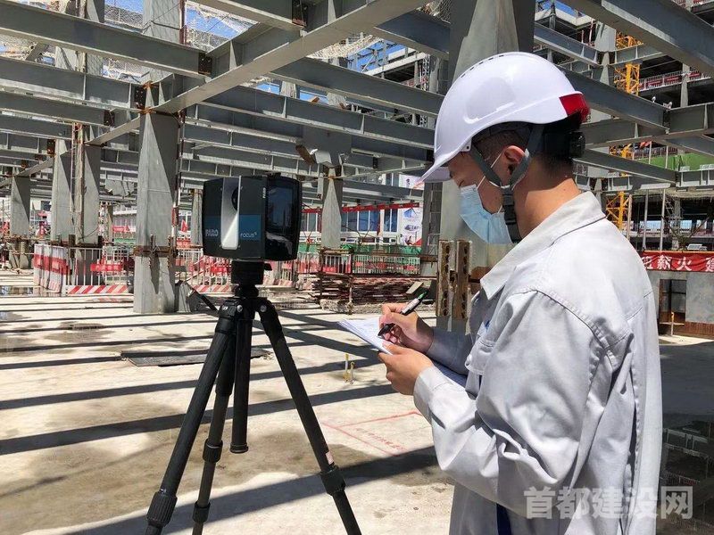 扛着三维激光扫描仪,项目BIM工作室的闫天伟来到施工作业面开始进行测量工作。“传统手段主要依靠人力搭配一些测量工具来完成建筑的‘实测实量’任务,而在测量的过程中往往需要2-3人进行配合,数据通过目测读数后记录在纸质记录表上,过程中人为因素影响大,这样不仅费时费力且数据的质量无从保证。与此相比,三维扫描技术具有明显优势”。项目党支部书记兼总工刘才说。