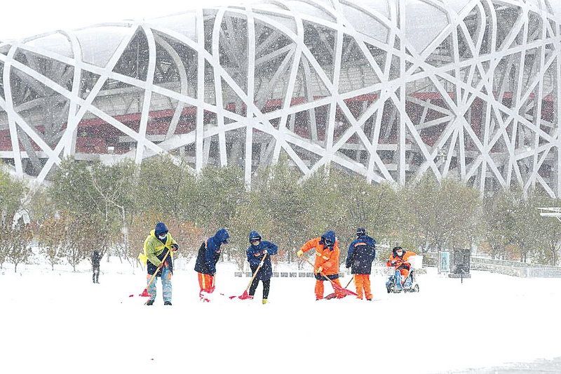 环卫集团奥园环境服务中心工作人员在北中轴景观大道扫雪 ■记者 周宇杰/摄