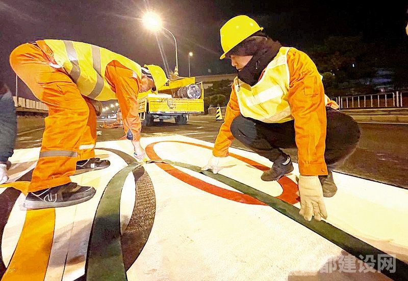 在积水潭桥施工现场,记者看到,本次冬奥会冬残奥会专用车道标志底色由4张白色长方形橡胶片组成,在经过涂胶处理后,根据现场测量放线结果,进行对齐粘贴裁切。相比以往一层层复贴工艺,本次施工方为提高车辆行驶舒适性,减少路面台阶感,特别采用“镂空填补法”施工,让整个标志均处于同一平面上。