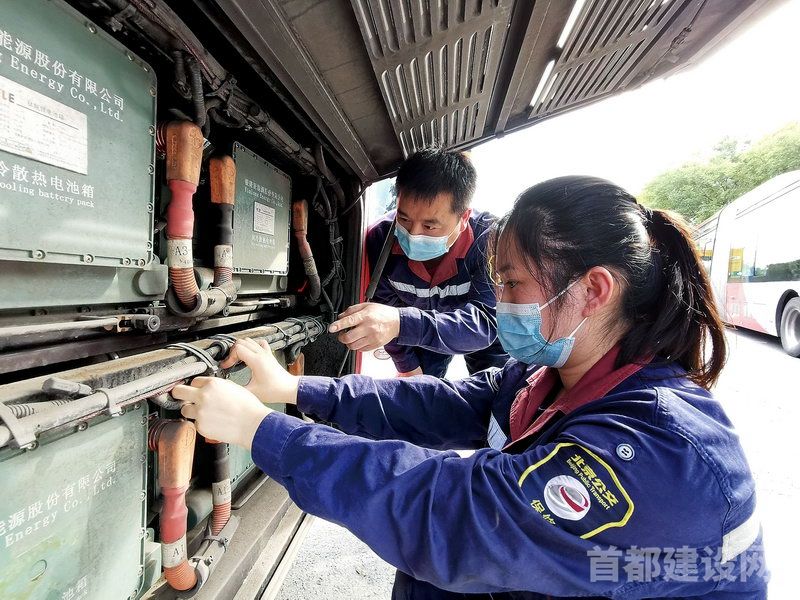 公交保修四厂张瑾(右一)和同事检修公交车 ■企业/供图