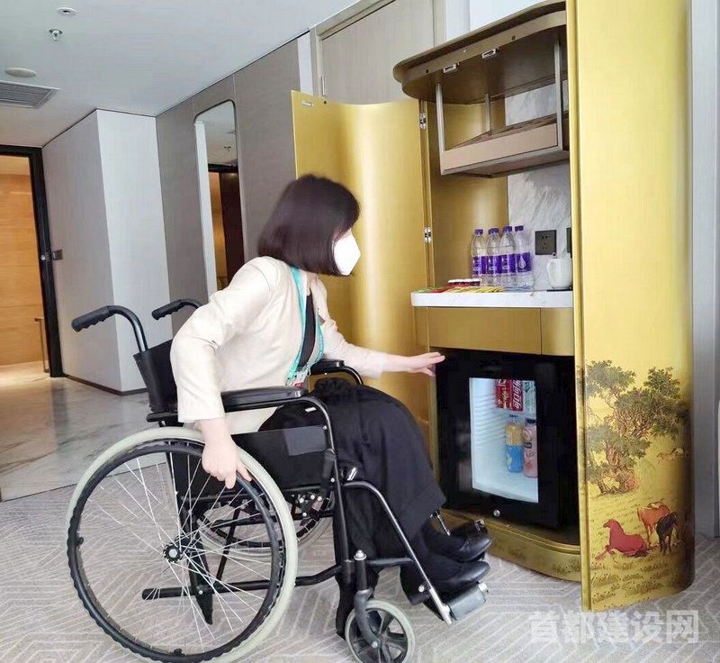 在酒店公共区域,无障碍环境随处可见。从停车位到酒店南门的一条无障碍通道,以及酒店南门广场区域增设的盲道,方便了残疾人通行。同时,酒店还改造了前台接待台,使其满足低位接待无障碍人士需求;酒店大堂和公共区域随处可见中英文无障碍标识和指引;酒店一层的大堂吧增加了无障碍坡道,方便无障碍需求人士进出大堂吧区域……