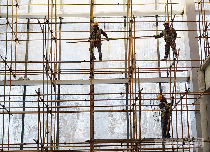 工人们在室内搭设脚手架 ■记者 张军/摄