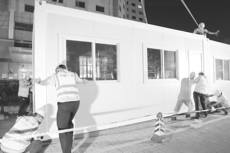 6月30日一早,52岁的于克民带领工友在东侧门诊楼前的空地上开始方舱基础施工。17时许,方舱基础施工完毕。23时30分,方舱运抵同仁医院。24时30分,三个集装厢式方舱吊装完毕。就位、找平、砌筑等工序连夜依次铺开……