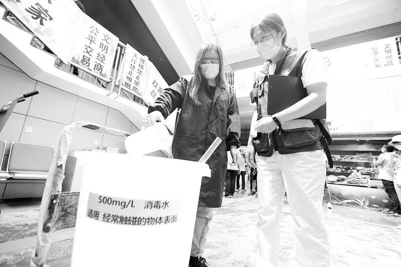 丰台疾控中心人员指导市场消杀员进行消毒水配比 ■记者 周宇杰/摄