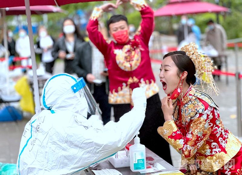 首钢医院医护人员为身着礼服的新婚夫妇做核酸 ■企业/供图