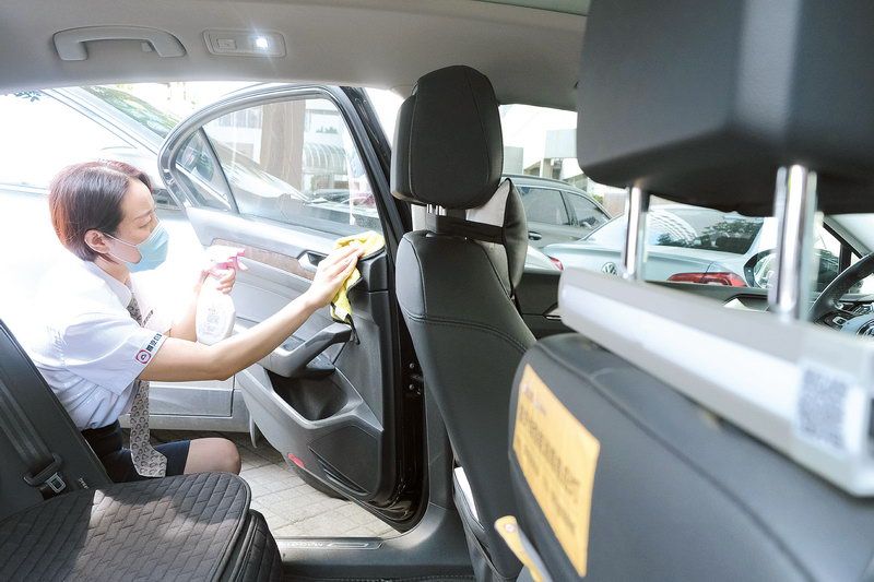 首汽约车驾驶员为送考车辆消毒 ■记者 董一鸣/摄