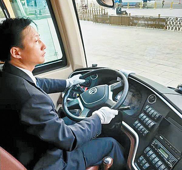 赵庆紧握方向盘行驶在街巷,金色大巴车身“首汽集团”的标识熠熠闪光,传递着“首汽速度”和“首汽温度”。