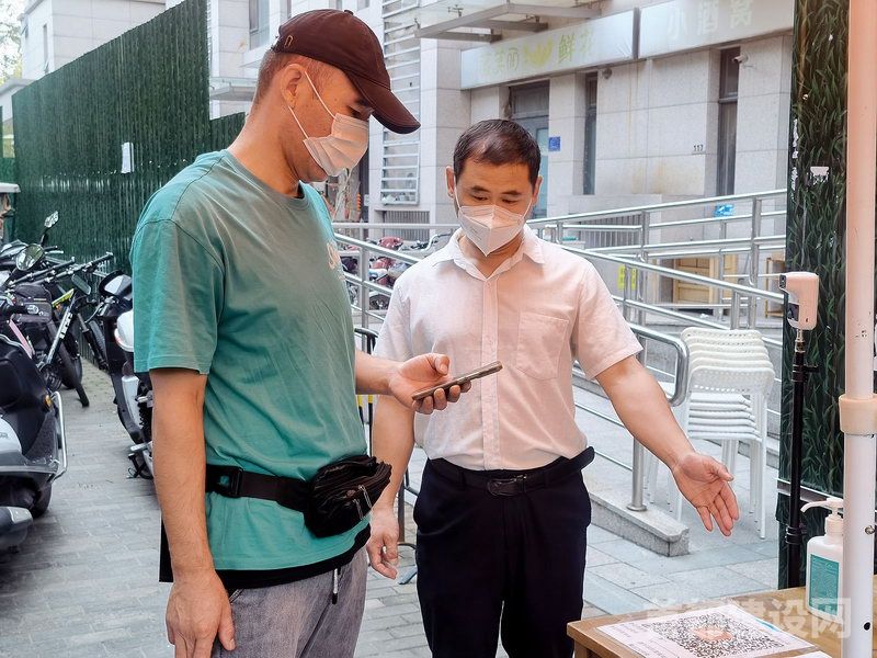 物业人引导外来人员扫码进入小区 ■记者 刘偶/摄