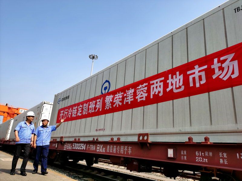 天津集装箱中心站对冷链物流市场进行了深入调研,针对客户需求与天津港冷链基地深度合作,打通冷链运输物流关键环节,为客户设计了个性化储运方案,实现“门到门”定制化运输模式。目前计划每月开行10列,160个冷藏集装箱。下一阶段将达到每月开行15列,240个冷藏集装箱。