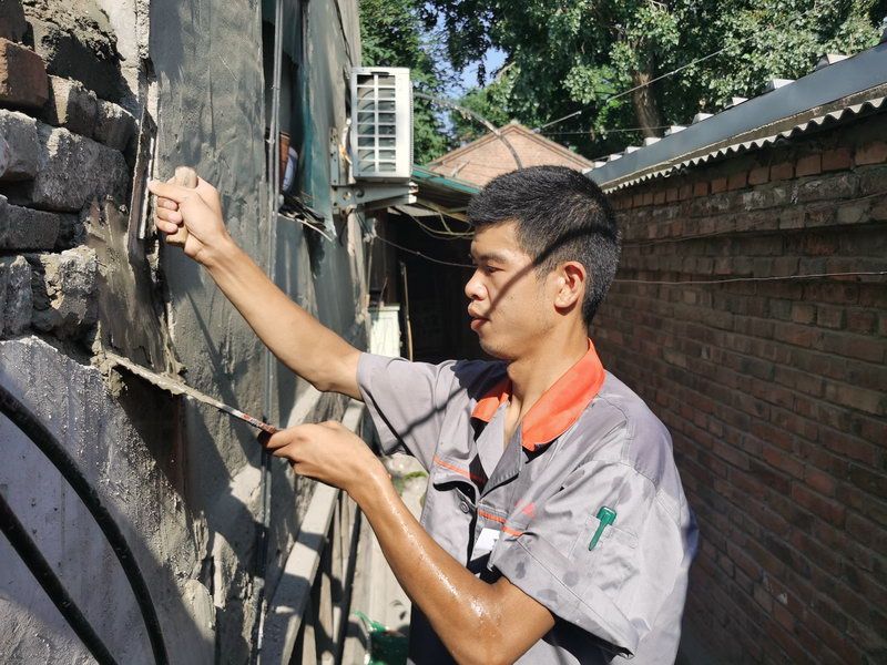 椿树准物业服务中心人员维修居民院子围墙 ■记者刘偶/摄