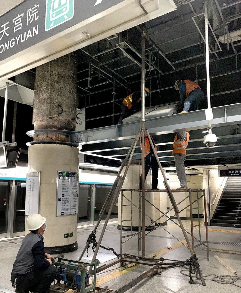 白天,地铁要在线上运营,只有晚上地铁停止运营后,施工团队才能在有限的“天窗点”内争分夺秒展开施工。“这也是为了不影响地铁的正常运营,将施工对乘客的影响降到最低,保障乘客在改造期间安全、顺畅出行。”张艳华说,4号线及大兴线运营时间长,每天夜间施工仅有3小时。在这有限的时间内,不但要进行施工,还要做好施工前的搭建、准备及施工后的清理工作。“这次站台层顶层施工需要搭建脚手架,搭建和拆除脚手架也需要占用一定的施工时间。针对这一情况,我们通过提前现场踏勘,施工前优化施工方案及流程,施工中严格监控,在确保安全的同时节约了时间。”