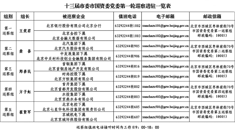 经市国资委党委批准,十三届市委市国资委党委第一轮巡察对北京银行股份有限公司北京分行、北京金控下属北京金融大数据有限公司、北汽集团下属北京汽车股份有限公司、中发展集团下属北京中关村科技创业金融服务集团有限公司、首钢集团下属北京首钢房地产开发有限公司、时尚控股下属北京方恒集团有限公司、首开集团下属北京首都开发股份有限公司、水投集团下属北京京燕水务有限公司、北京电控下属北京七星华电科技集团有限责任公司、京城机电下属北京京城环保股份有限公司等10家二级企业党组织开展巡察。