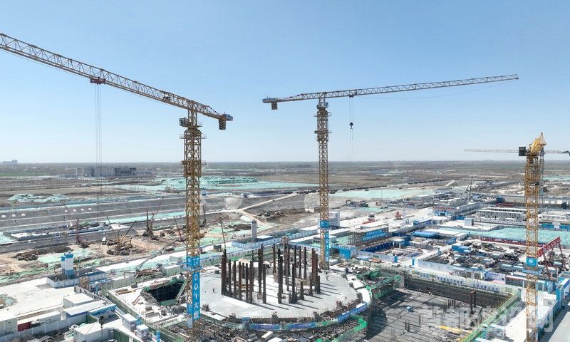 “这些70米长的灌注桩犹如‘定海神针’被牢牢打进土体中,利用钢筋笼底部和侧面预先埋设的注浆管,在成桩后用高压泵进行高压注浆,浆液通过渗入、劈裂、填充、挤密等作用与桩体周围土体结合,固化桩底沉渣和桩侧泥皮,起到提高承载力、减少沉降等效果。”项目总工邢承喜告诉记者。由于施工区距离白洋淀水系仅800米,当地丰富的地下水资源不仅带来基坑排水难题,同时伴随着结构抗浮问题,结构施工阶段需进行持续水位控制以避免大楼“像船一样浮起来”。