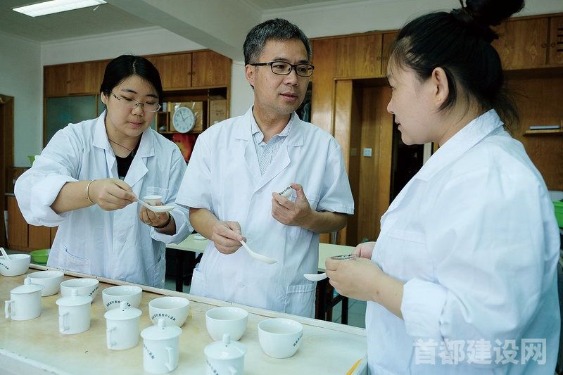 京华茶业公司总经理助理、“北京茉莉花茶拼配工艺”非物质文化遗产项目第七代传承人楼国柱(中)进行茶叶审评。