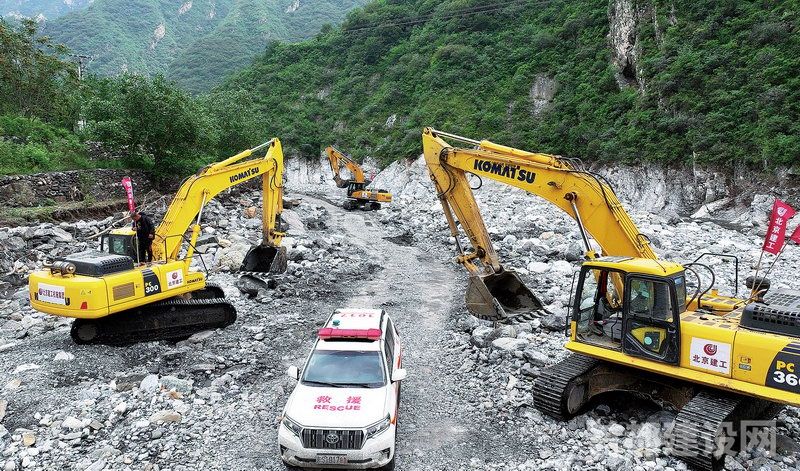 在36小时打通10个村全部“生命通道”的同时,北京建工机施集团迅速集结600多名突击队员,200辆挖掘机、10台推土机、20台装载机向山区进发。