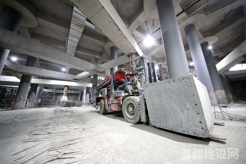二区整体为盖挖逆作法施工,即先在地面施工顶板,再逐层向下挖土,每挖完一层土后,主体结构的梁柱、楼板等随即施工。宋杰表示,二区以关门日期为依据倒排每一天工期,以工作量来制定劳务人员、材料物资、设备物流的组织调配,每一层施工都采取平端方式,“这种方式没有流水段,所有区域同步作业,比如,B2层施工时大约1000人同时作业,加上机械设备和物资供应,场面极为壮观。”宋杰说。