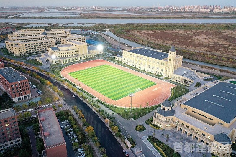 站在崭新的足球场中央,北京建工六建集团天津滨海新区北塘国际学校项目党支部书记李洪福和同事们伸出大拇指,与背后出自他们之手的欧式风格体育馆来了一个合影。