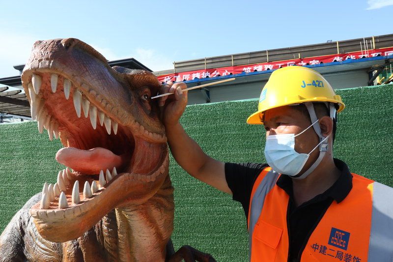 雕刻师邬思刚为恐龙上色 ■记者 刘偶/摄