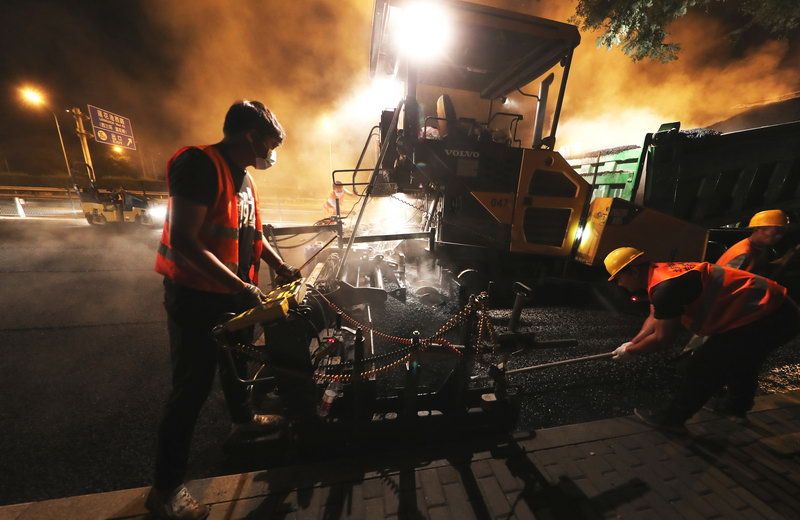 8月29日零时刚过,南沙窝桥西四环辅路路面上,两台摊铺机和压路机已经准备就绪,十几名身着橘黄色制服的工人拿着铁锹和耙子,在机器之间忙碌地进行动工准备。刚运到现场的沥青冒着白色热气,滚滚热浪袭来,把施工现场的温度提高了三四摄氏度。