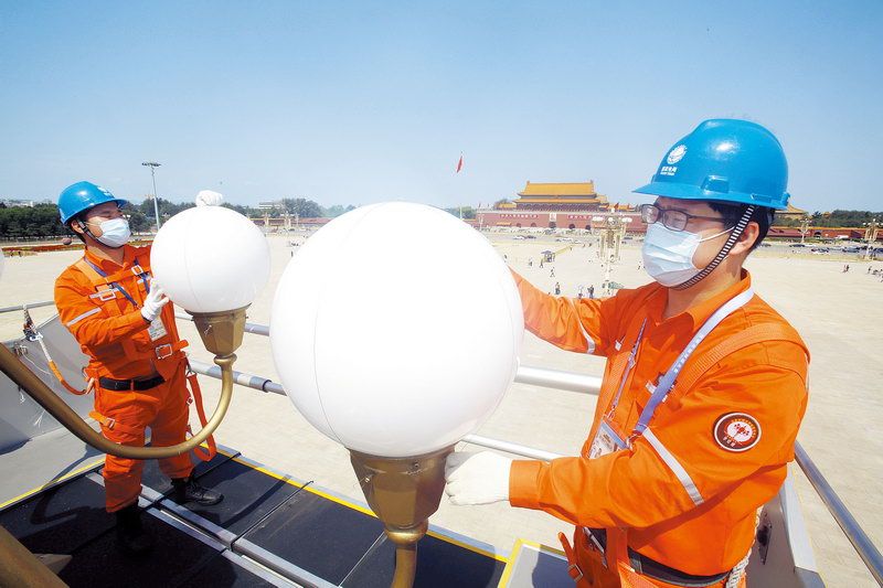 为保障天安门广场及长安街华灯可靠稳定运行,北京市城市照明管理中心华灯班每年都会对华灯开展一次例行清洗和检修工作,对华灯进行擦拭、清洗、检修、加固,同时对华灯光源、线路、镇流器、保险等元器件进行核对记录,为日常运行提供详细依据。