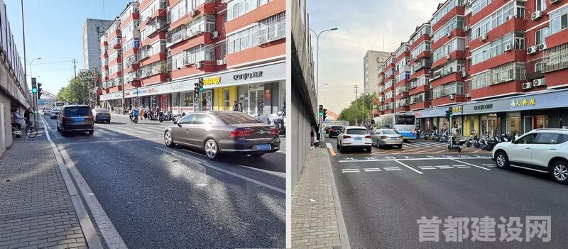 西四环外环辅路丰台大桥局部路段改造前(左)和改造后(右) ■市交通委/供图