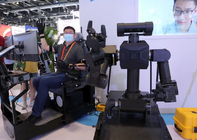 中国中铁电气化局自主研发的第三代运维巡检机器人亮相服贸会综合展区,记者在现场看到,这款机器人上半部分拥有常见的机械外形,下半部分为履带式结构,“酷炫黑”的外表为中国中铁电气化局展台带来不少人气。