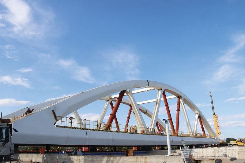 记者了解到,钢拱桥紧邻京哈铁路、通燕高速,上跨城市副中心主干道通济路,距离京哈铁路最近处仅有15米。为了最大限度降低对社会交通正常运行的影响,北京市重大项目办牵头组织参建单位专题研究、多次论证,将满堂支架现浇混凝土拱桥优化为全焊接钢拱桥,全桥采用先横移再纵推的方案进行施工。