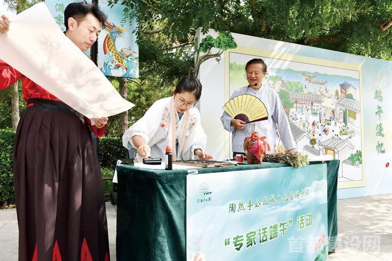 在陶然亭公园,民俗专家高巍身着传统服饰,为市民游客讲解展示端午节的起源、习俗和文化内涵 ■公园管理中心/供图