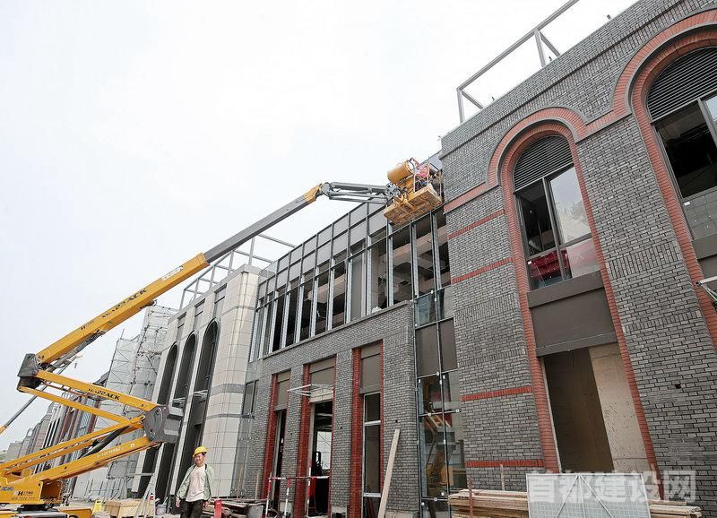在位于前门大栅栏商业街区西侧的北京坊二期施工现场,青砖外墙搭配红色装饰线条的外立面已经亮相,几名工人正搬运着装饰材料进入楼内。
