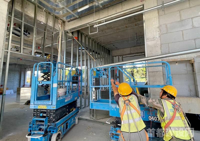 施工现场一片繁忙景象,塔吊林立、车辆往来、机械轰鸣,数百名穿着反光背心、头戴安全帽的工人在脚手架“丛林”中穿梭。记者看到,伴随着综合楼主体结构封顶,整体工程已初见雏形。