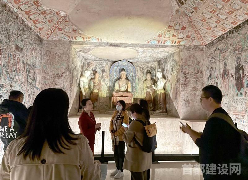 在复刻的莫高窟石窟内,工作人员正在为观众讲解 ■记者 周宇杰/摄