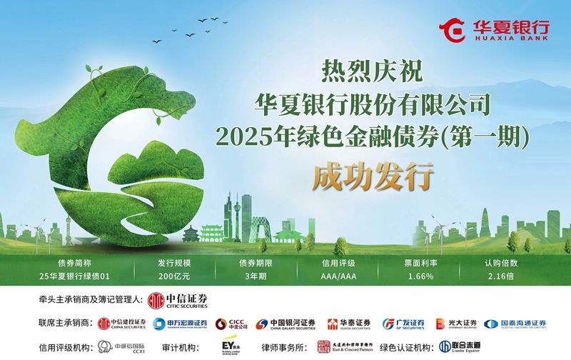 7月21-23日,华夏银行股份有限公司2025年绿色金融债券(第一期)成功发行。债券基本发行规模150亿元,附不超过50亿元超额增发权,最终发行规模200亿元,票面利率1.66%。