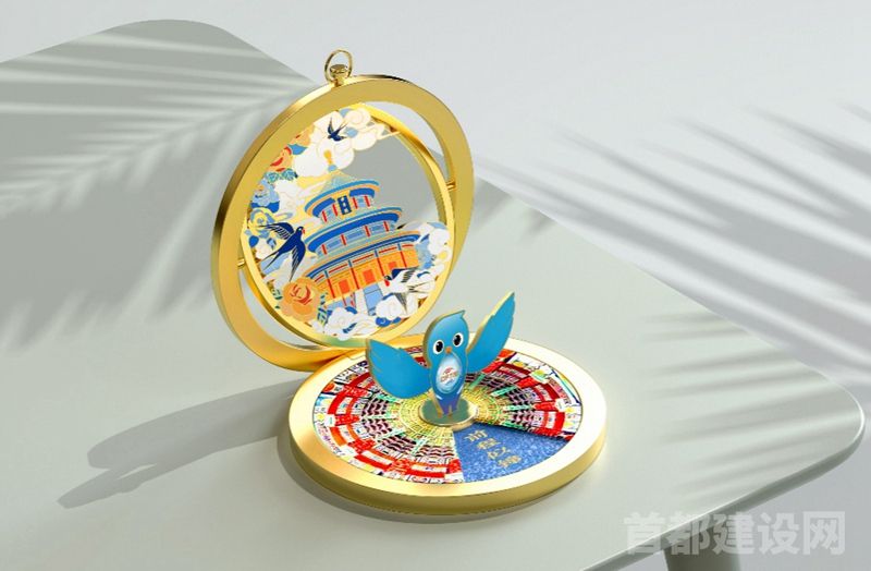 据介绍,服贸会祈福文创系列旋转徽章是以北京三大文化地标天坛、颐和园、景山的文化元素为灵感,打造出“福燕”IP旋转多功能摆件。