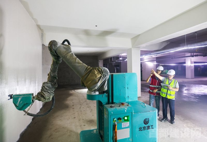 工人点击平板电脑上的确定键后,眼前一人多高的绿色机器发出指令识别的“咔咔”声响。5秒钟后,随着4个红外线激光定位点完成校准,机械手臂开始对墙面进行喷涂——约10秒钟,一片0.5米宽、3.7米高的区域便被均匀喷成白色。这一幕发生在北京建工土木公司通州益生祥明科技产业园项目地下室。在这里,完成喷涂工作的不再是工人,而是喷涂机器人。