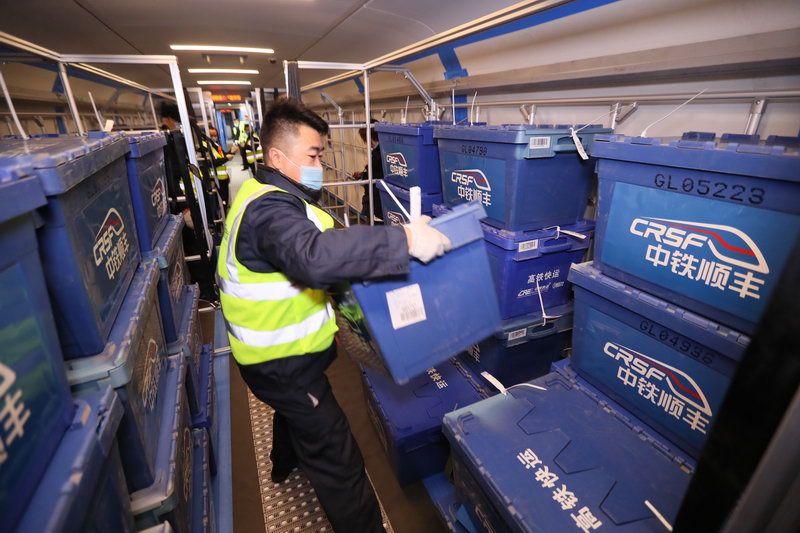 工作人员将快件装上复兴号“快递专列” ■记者 周宇杰/摄