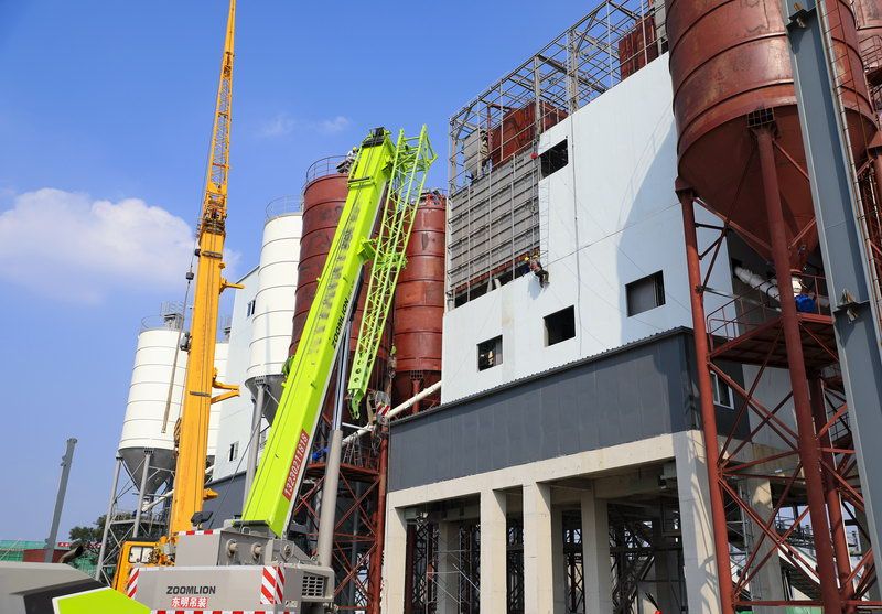 蔚蓝的天空下,在绚烂的夏花和茂密的绿植映衬中,银灰色钢构件通廊承载着96米长的架式高空骨料斜皮带犹如列车轨道急速运转着。4套搅拌机已经换下了绿色的防护衣,20个巨型的粉仓紧贴主楼四周;内设线路已铺设成网,地面上工人穿梭往来,吊车、铲车帮着搬运和吊装材料,一切忙而不乱。