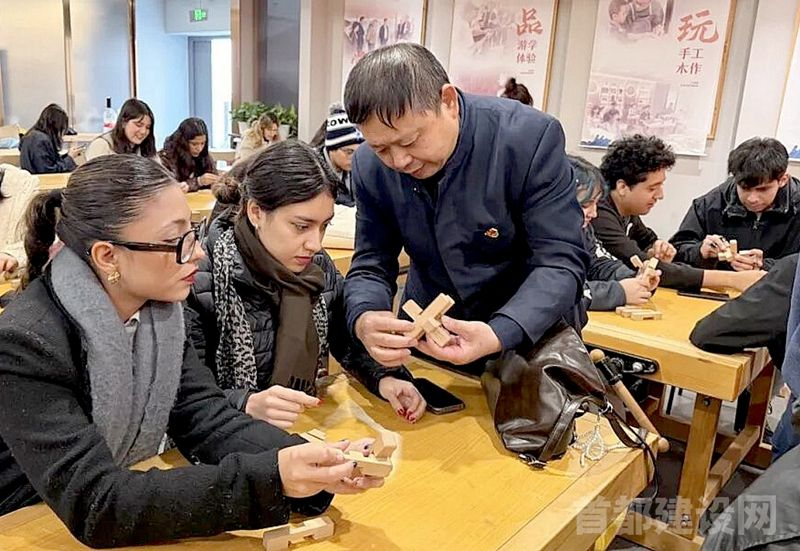 清晨的阳光洒在金隅龙顺成文化创意产业园的朱红大门上,雕花木窗映着晨光,空气中还飘着淡淡的木材清香。几十位墨西哥留学生背着背包,脸上带着好奇的笑容,不时对着园区里陈列的传统木作摆件拍照,有的还凑在一起小声讨论着那些精巧的木纹图案,一场关于京作家具非遗文化的探索之旅,就在这样的期待中拉开了序幕。10月24日,作为2025年“首都国企开放日”系列活动的重要一站,金隅龙顺成文化创意产业园迎来了北京城市学院国际交流学院的24名墨西哥留学生。本次活动以“非遗传承见匠心 文化交融谱新篇”为主题,通过沉浸式参观、互动体验等形式,让国际友人近距离感受京作家具的非遗魅力,展现首都国企在文化传承与创新领域的担当,彰显其在相关领域的地位。