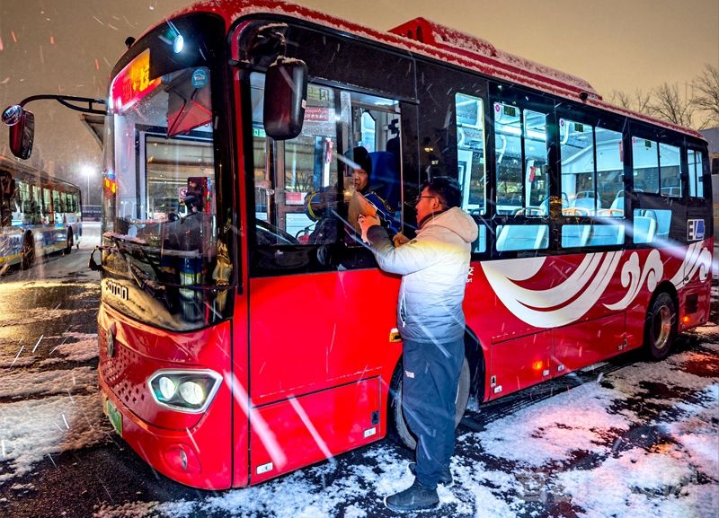 记者了解到,电车分公司提前研判,重点对运营车辆制动、暖风、灯光、雨刮器等关键部位开展全方位检查,确保运营车辆车况良好;叮嘱驾驶员严格遵守恶劣天气驾驶操作规程,控制车速、保持车距、平稳驾驶;同时在车辆进出站、转弯等节点,提醒乘客握紧扶手、注意防滑,保障乘车安全。管理人员深入一线维护运营秩序,清理站台积雪,为车辆安全进出站、乘客便捷上下车营造安全环境。