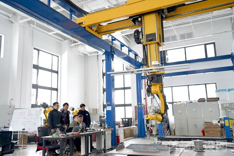 在配天机器人实验室内,记者目睹了这一技术突破的效果。一块异形钢结构件被放置在工位上,操作员在手持终端轻点,数据采集、回传、识别、路径规划、焊接启动——全程流畅。从工件就位到第一道焊缝完成,不到三分钟。