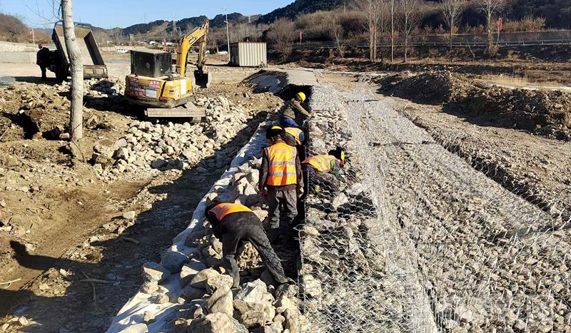 在杨各庄桥附近作业面,数十名工人分工协作,有的码放铅丝石笼,有的浇筑混凝土,现场紧张有序。项目自去年11月16日开工以来,截至目前,已累计完成总工程量的60%。为确保“4·30”完工目标,项目在正月初八复工,全力推进。