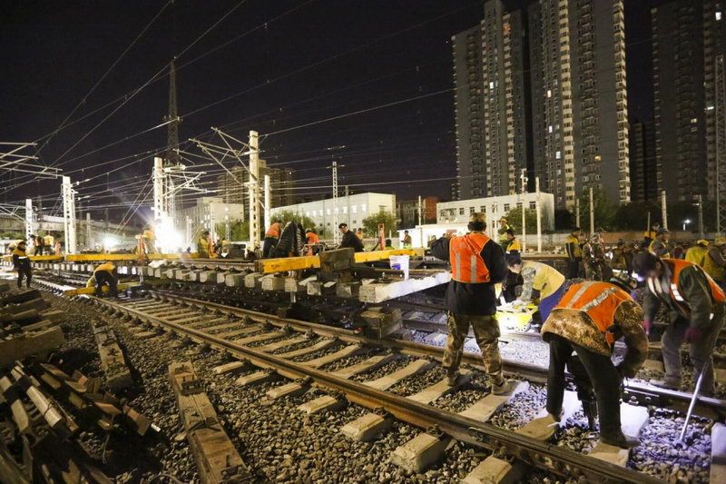 “一、二、三,推!”随着现场施工人员的号子声,道岔被缓慢移动到指定位置。撤除顶墩后,道岔还要进行精调。“北京西站换道岔施工技术标准高、施工难度大,夜间施工、作业时间紧,这给我们的技术人员带来了很大挑战,大家白天简单休息后,就要聚在一起细化施工方案。大家下定了半个月连轴转的决心,坚决提高作业质量和工作效率。”车间主任李生辉介绍说。为了保证施工质量,该段线路科牵头制定施工方案,开启“私人订制”模式,因地制宜确保“一日一方案”,保证精细化卡控安全风险项点。