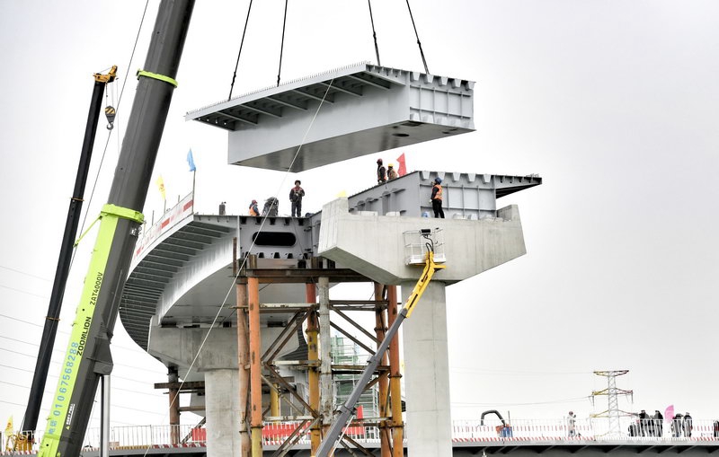 最后一片钢箱梁成功吊装跨越京哈高速 ■记者 董一鸣/摄