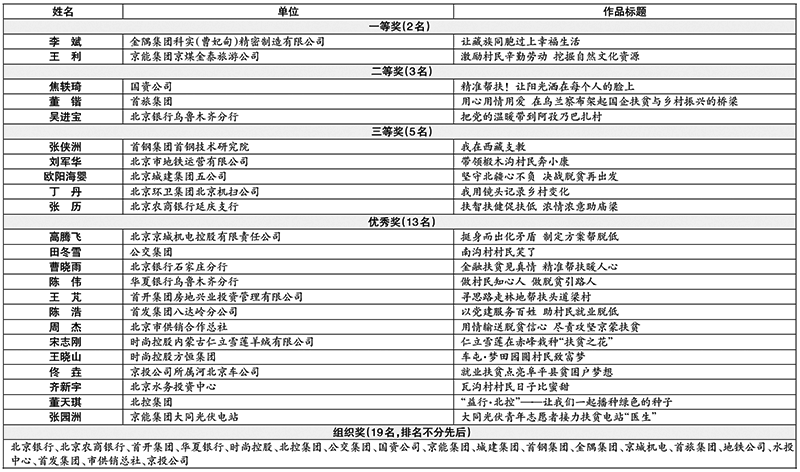 由市国资委主办,“国资京京”、首都建设报社承办,北京银行、北京农商银行协办的“我的扶贫故事”征文活动圆满结束。经过评选,23位作者在本次征文活动中获奖,其中一等奖2名、二等奖3名、三等奖5名和优秀奖13名,并有19家企业获得组织奖。