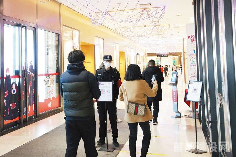 王府井百货大楼入口处安排了工作人员,提示顾客佩戴好口罩、扫健康码 ■记者 张军/摄
