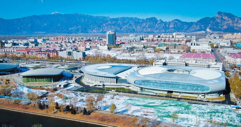 在延庆妫河畔,有一座由半圆形“冰球”和圆角方形“冰壶”组合而成的“天圆地方”冰上场馆群,它是目前亚洲最大的单体冰上项目训练中心——北京冰上项目综合训练馆。“我们这个项目造型有‘天圆地方’的寓意。”施工方住总北京市冰上项目训练基地项目负责人杨昕说。