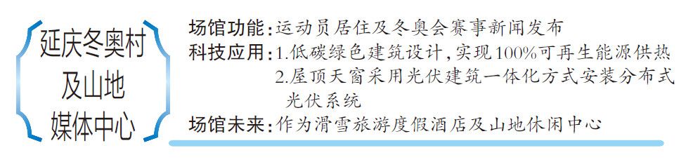 延庆奥运村、新闻中心按低碳绿色建筑设计,将实现100%可再生能源供热。新闻中心屋顶天窗采用光伏建筑一体化方式安装分布式光伏系统,借助“互联网+”及5G智能技术,新闻中心将建设“绿色智慧能源展示中心”,实现整个能源网络的智能化、高效化。
