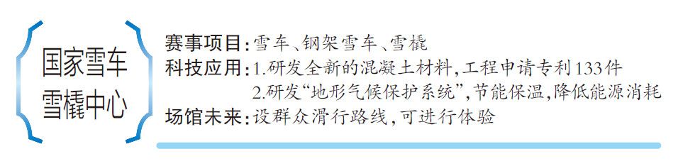 国家雪车雪橇中心位于延庆赛区核心区南部,该赛道为全世界第17条,亚洲第3条,中国首条雪车雪橇赛道。赛道全长1975米,垂直落差121米,由16个角度、倾斜度各异的弯道组成,包括在世界上都非常少见的360°回旋弯道。赛道最高设计时速达到135公里,因此赛道设计建造要求极高,要精细到每一个角度、每一个曲面、每一个毫米级的细微之处。