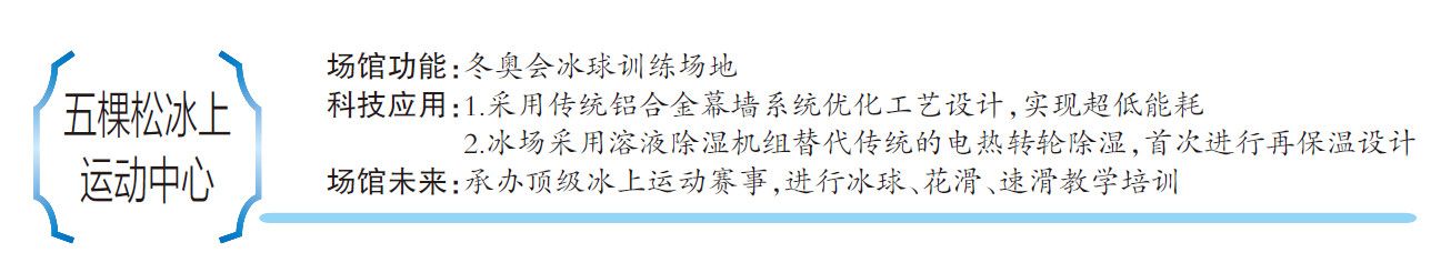 坐落于长安街沿线五棵松桥边的五棵松冰上运动中心,总建筑面积为3.8万平方米,地下2层,地上2层,建筑高为17.25米,内含一块标准比赛冰球场、一块标准训练场和一块室外冰球场,还包括一个剧场、比赛配套服务、体育文化互动体验等功能用房。施工方中建一局建设发展公司五棵松冰上运动中心项目经理冯延军介绍,运动中心于2020年11月底完工,将作为北京2022年冬奥会冰球训练场地。冬奥会结束后,将主要承办顶级冰上运动赛事,进行冰球、花滑、速滑教学培训。