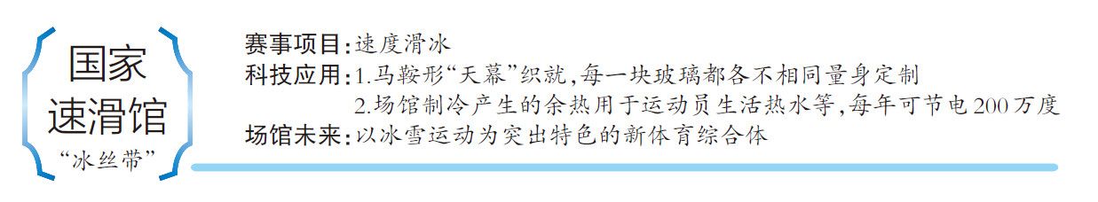 2022年冬奥会,国家速滑馆“冰丝带”将承担速度滑冰项目比赛。这座场馆比赛区包括三条400米速度滑冰比赛道、一条速滑比赛练习道、一块60×30米多功能冰场(短道速滑模式)、一块61×31米多功能冰场(冰球与花样滑冰模式)以及一块活动冰场。