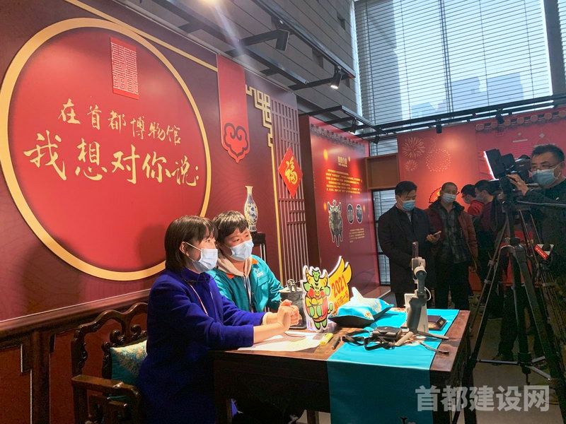 首都博物馆内装饰的喜气洋洋,大红灯笼高高挂起,以国宝“伯矩鬲”为原型“首伯牛”摇摇晃晃走在大厅里,吸引一波波观众前来合影。博物馆二层方厅平台,一场特殊的直播连线正在进行——“爸爸妈妈,今年我在北京过年,你们别担心我!”对着直播屏幕,来自北京城建集团东馆建设项目部的小叶隔着屏幕给远在外地的父母拜大年。这个春节,他和许许多多的建设者一样,做出了留京过年的决定。通过首都博物馆快手直播平台、首博文化抖音平台,来馆过年的建设者们连线家人送出新年祝福。